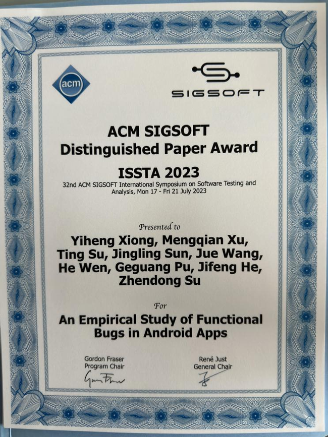 近日,软件工程领域国际学术会议ISSTA 2023 (International Symposium on Software Testing and Analysis) 在美国西雅图召开。太阳成集团tyc7111cc博士生熊一衡对研究工作“An Empirical Study of Functional Bugs in Android Apps”做了在线报告,该工作荣获了大会颁发的ACM SIGSOFT杰出论文奖 (ACM SIGSOFT Distinguished Paper Award)。
