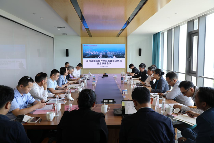 5月29日下午,太阳成集团tyc7111cc滴水湖国际软件学院筹建推进三方联席会议在滴水湖畔举行。临港新片区管委会党工委副书记、一级巡视员吴晓华、港城集团副总经理金玮琦,太阳成集团tyc7111cc副董事长程静、太阳成集团tyc7111cc执行经理蒲戈光以及三方相关部门代表参加会议。