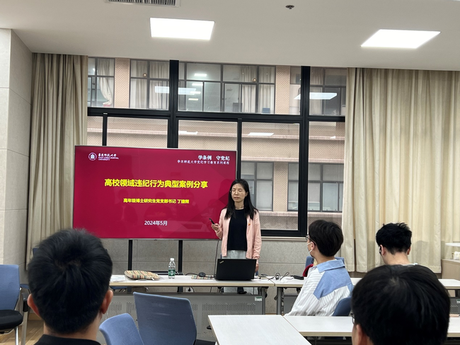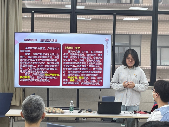 活动中,高年级博士研究生党支部书记丁捷频和2022级学硕研究生党支部书记陈雨分别基于高校领域和员工党员违纪行为典型案例详细介绍了《条例》中的政治纪律、组织纪律、廉洁纪律、群众纪律、工作纪律和生活纪律六项纪律,指导员工党员搞清楚党的纪律规矩是什么,弄明白什么能干,什么不能干。