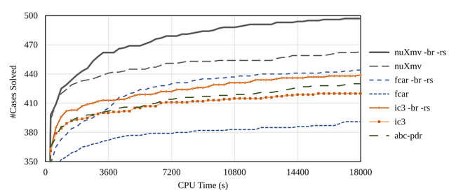 除了IC3/PDR外,该工作还涉及另一种模型检查算法互补近似可达(CAR)的评估,该算法由夏晔川导师、学院青年研究员李建文提出。将优化方法应用于开源的IC3和CAR工具后,它们的性能能够优于Berkeley大学开发的模型检查工具ABC。此外,该工作与开发了著名模型检查工具集nuXmv的小组合作,将优化方法运用于该商业工具,该全新的优化策略使得高度优化的nuXmv的性能也得到了提升。
