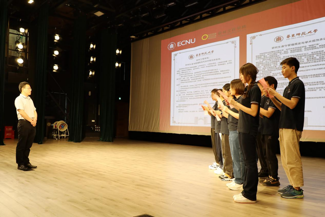 新生代表们做遵守管理规定与学术规范承诺,学院副经理邓玉欣代表学院见证承诺。