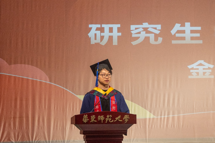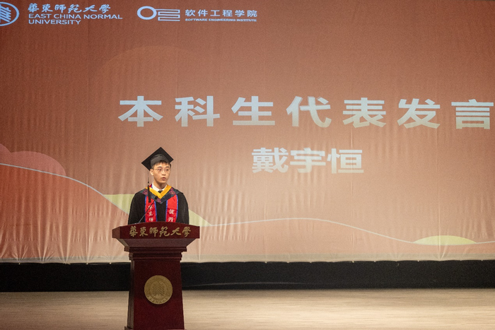 2020级软件科学与技术方向、上海市优秀毕业生戴宇恒同学作为本科优秀毕业生代表发言。他通过一个信封引入,代表同学们表达了对学院、老师和亲友的感激之情;以列车比喻人生,鼓励大家珍惜拥有、勇敢追梦。