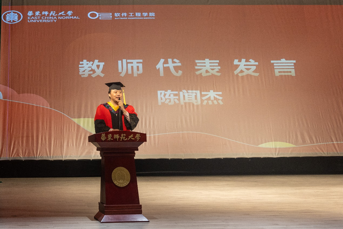 典礼伊始,嵌入式软件与智能系统系副系主任陈闻杰作为学院教师代表向同学们送上希冀与嘱托。陈老师鼓励同学们在风云激荡的大时代建功立业,并“搬运”了四句古人“金句”送给即将走上社会的同学们:与人方便,自己方便;己所不欲,勿施于人;礼闻来学,不闻往教;以德报德,以直报怨。