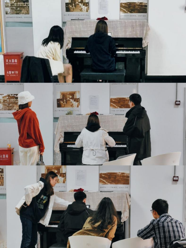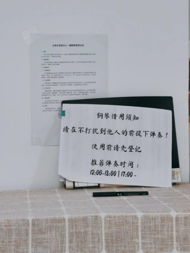 机会是需要自己创造的。利用已有资源的同时,也不必害怕提出需求,通过主动沟通和争取,让学校资源物尽其用。比如老员工活动中心一层的钢琴,闲置许久,琴键早已落灰,但却是中北校区不可多得的一台好琴。为了争取这台钢琴的使用权,我与大夏书院的老师主动沟通,与同行的学姐学长一起协商钢琴的使用公约,并制作登记表,还请到了钢琴协会里会调律的同学,对坏键进行了修缮和整音。同好们自发的行为让大夏书院每日都有乐声传来,这台旧琴的再次使用,为练习和团建提供了极大的便利,大家共同的兴趣得以发展。