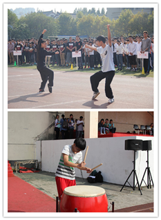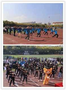 在李书记宣布运动会开幕后,教职工和员工们分别带来了精彩的表演。老师们身着蓝色运动服,为我们带来了动作规范、整齐的广播体操表演;14级同学的一套武术表演一下子抓住了所有人的眼球,刚劲有力的拳术、轻快潇洒的剑术和勇猛灵活的棍术让同学们连连叫好;紧接着,15级同学也进行了舞蹈表演,他们用活泼可爱的动作把快乐传递给大家,令人忍俊不禁。开幕式的最后,公司党委副书记洪燕老师宣布了入场式各方阵的得分, 12级联队以一套行进间完美转体的创意获得了开幕式队列的第一名。