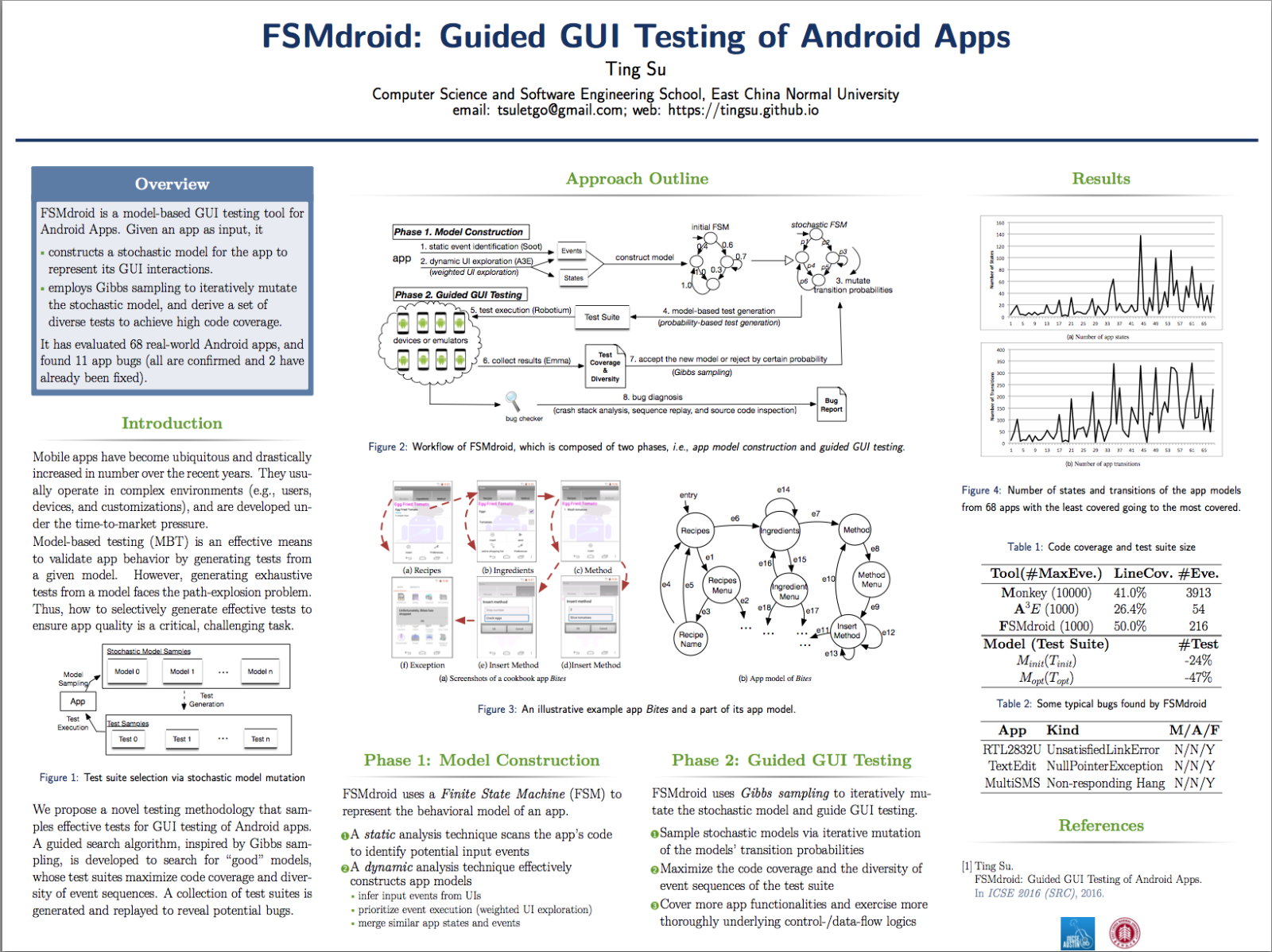 苏亭师从何积丰院士和蒲戈光教授,曾在美国UC Davis大学Zhengdong Su教授的研究团队中访问学习一年。他在国际顶级学术会议ICSE、PLDI 上发表过多篇学术论文,曾获学院首届“员工杰出青年”称号。他本次参赛的论文题目为“FSMdroid: Guided GUI Testing of Android Apps”,创新性地提出了一种针对安卓应用程序的自动化测试技术,他与团队成员研发的测试工具FSMdroid能够完全自动化地对安卓应用程序进行深度测试,目前已经检测出了安卓应用程序的10多个漏洞,并均已得到应用程序开发者的确认和修复。
