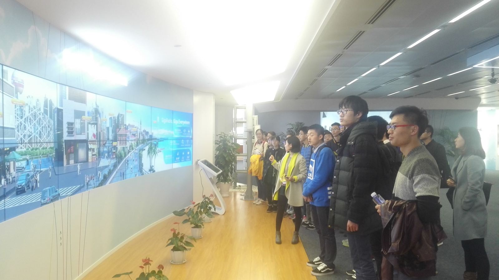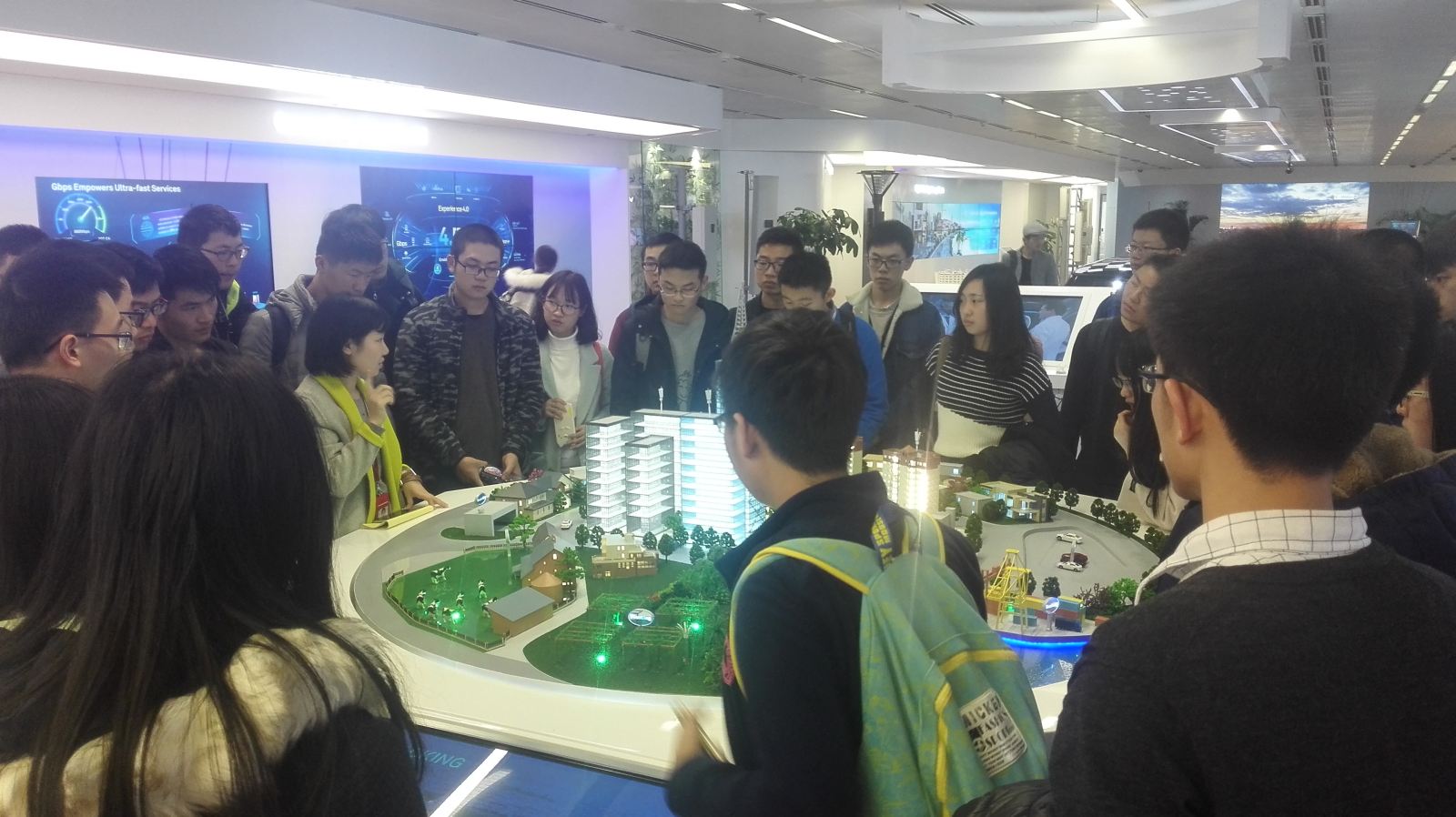 最后,我们参观了华为MBB(移动宽带业务)体验中心。在这个展厅中,我们提前感受到了智能时代的到来。这个展厅以“共建更美好的全联接世界”为主题,里面主要展示的包括MBB容量提升、众包小站的实景展示、LTE大事件体验到CloudEdge、5G的炫酷方案动画展示,还有不少手机和平板电脑终端。5G时代的构想,集路灯、监视器、充电桩等功能的移动网络基站,新概念汽车都让同学们叹为观止。最震撼的莫过于物联网时代的城市模型,让我们看到了一个人与人相连、人与物相连、物与物相连的智能化时代。