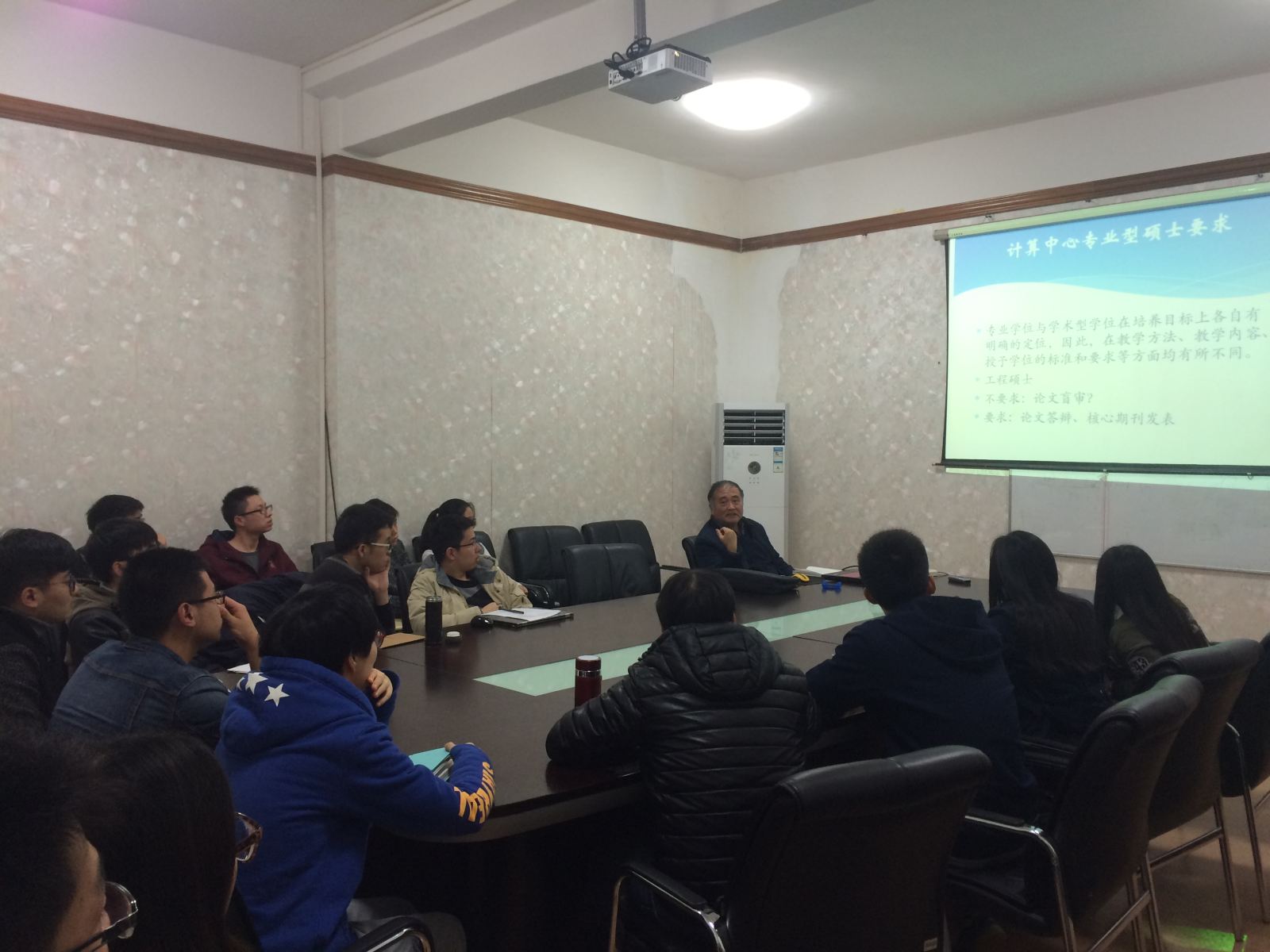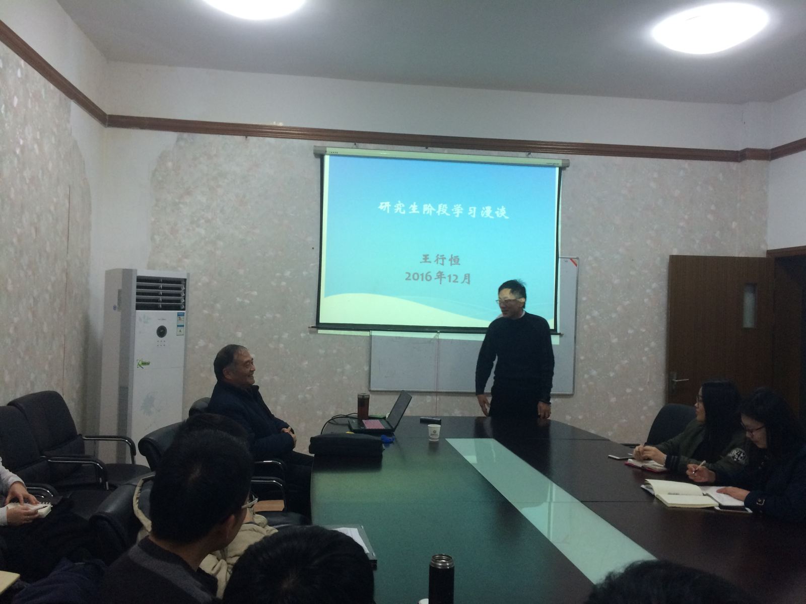 2016年12月7号下午三点,公司计算中心在计算机楼会议室214,学院关工委王行恒教授为公司2016级全体研究生带来一场“立足自身发展,打好坚实基础——研究生阶段学习漫谈”的精彩讲座。计算中心主任郑骏教授应邀参加此次活动,本次讲座由计算中心团支书赵红主持。