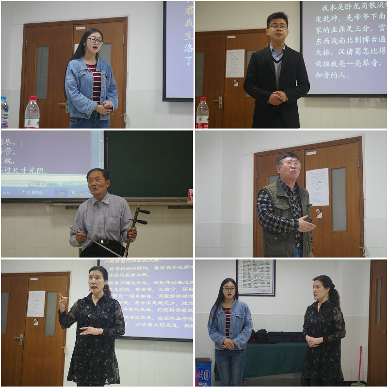接下来为了同学们更好的理解京剧唱段,徐老师邀请到来自京剧社的老师同学们,现场表演了《空城计》、《苏三起解》、《洪羊洞》、《锁麟囊》这些京剧著名选段,同学们也被京剧的魅力深深吸引,全场师生对精彩的表演报以热烈的掌声。之后,徐老师号召全程同唱《梨花颂》,美妙的京剧飘扬在整个教室之中。
