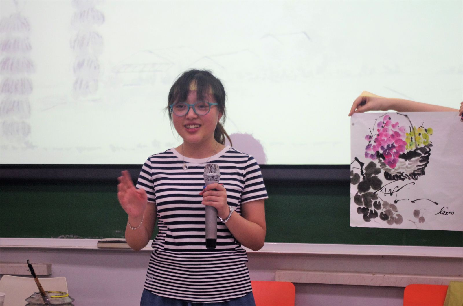 随后,龙媛琳和郭梓炫同学讲解有关国画的基本知识。活动中,她们以葡萄为例教授,并向同学们讲述单色与多色葡萄的不同画法。用淡淡的墨勾画出一颗颗晶莹的葡萄,在老师的指导下同学们都有了很大的进步,对国画有了更深刻的认识。