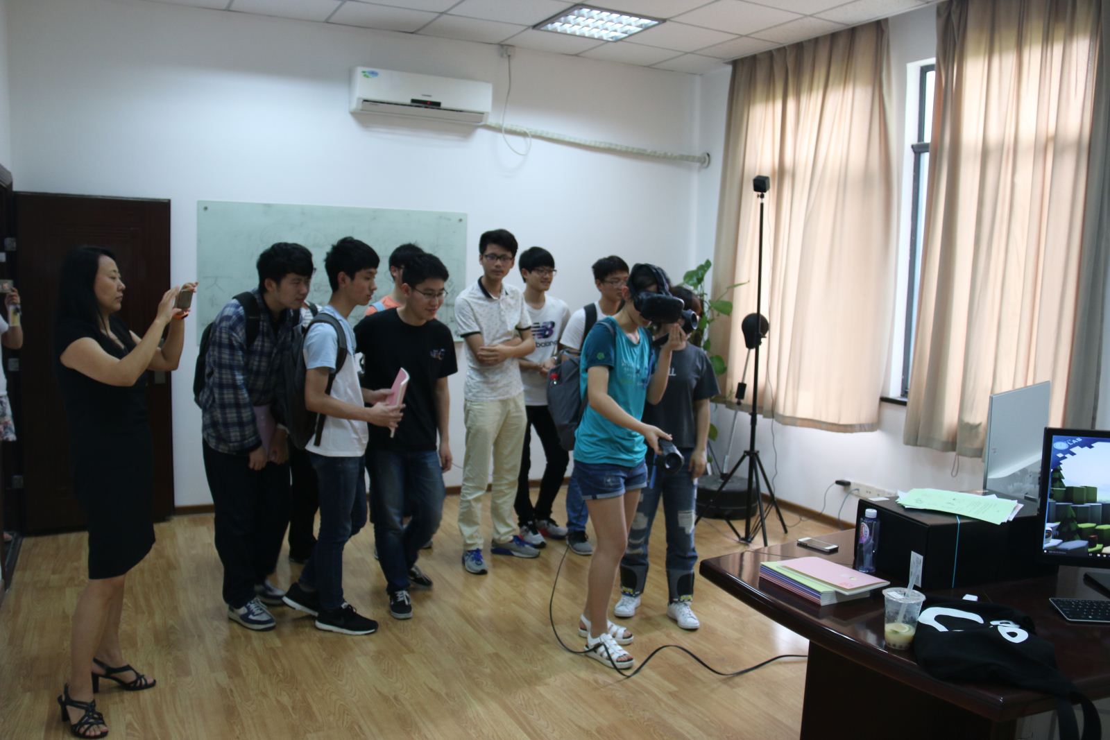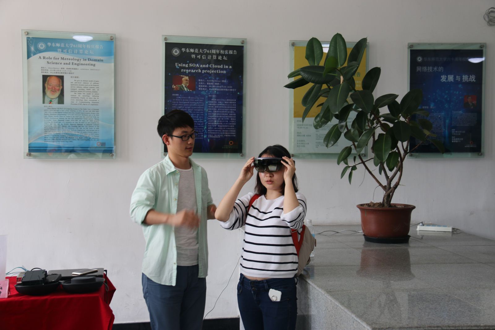 接着,本科生参观和体验了“虚拟骑行”、传感云交互平台、机器人和无人机、智能家居系统、音节输入的手套、可信软件工具、智能物联网系统、工控实景AR交互系统、图像处理硬件加速设备、kinect的生理机能检测、基于Multisim的电路原理仿真等项目,并与研究生进行了深入交流。