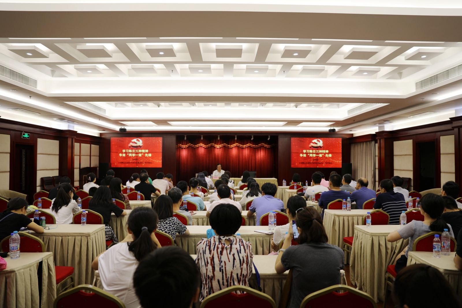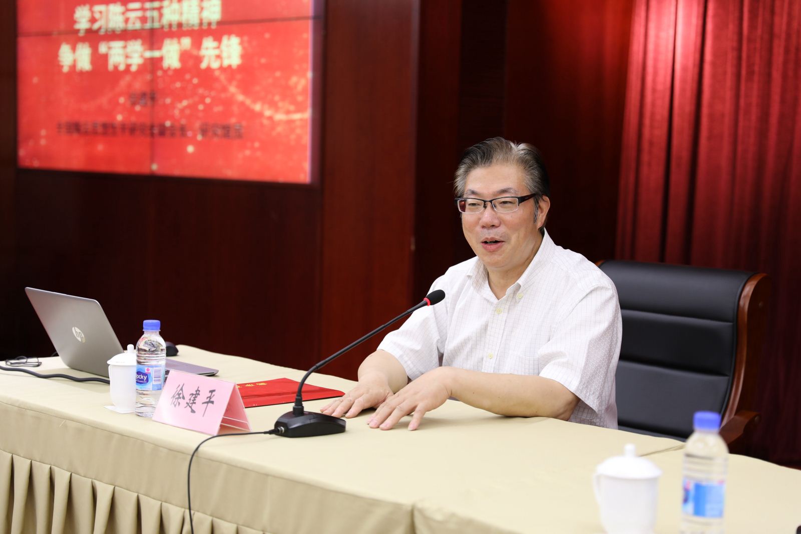 紧接着,党员们共同聆听了由全国陈云思想生平研究会副会长、全国陈云纪念地理事会理事长、研究馆员徐建平馆长主讲的微党课《学习陈云五种精神,争做“两学一做”先锋》。徐馆长从陈云同志的生活和工作细节入手,通过向大家讲述陈云坚守信仰、党性坚强、一心为民、实事求是、刻苦学习“五种精神”的内涵,引领党员们一起走进了一代无产阶级革命家简朴和不懈奋斗的一生:他加入中国共产党,从此自觉“此生已非昔比,今后要专干革命”——这是坚守信仰的精神;他一生粗茶淡饭、轻车简从——这是党性坚强的精神;他说“我们做工作、制定政策,要用90%以上的时间用来调查研究”——这是实事求是的精神;他曾在上世纪80年代关心北京大白菜“烂菜”的问题——这是一心为民的精神;他只读过小学,但能在长期实践中坚持不懈地刻苦学习,从而具备了很高的思想理论水平和解决问题的能力——这是勤奋学习的精神。在徐馆长看来,“老一辈无产阶级革命家的思想风范,是当今‘两学一做’的生动教材,对全面从严治党向基层延伸、提升党员的思想境界,有着极为深刻的现实意义”。徐馆长深入浅出的讲述,不仅让党员们全面而深入地了解了一代伟人的事迹,更是让大家从一个国家领导人成长的角度再一次学习了党的历史。