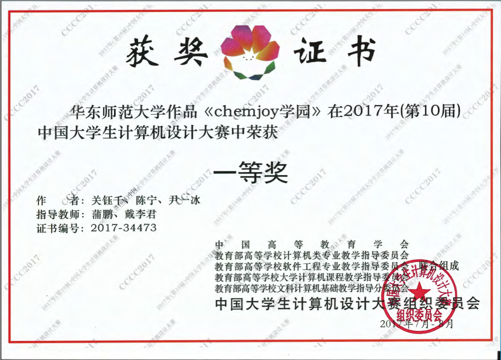2017年8月9日下午2017年(第10届)中国老员工计算机设计大赛微课与教学辅助组决赛在安徽合肥降下帷幕。由计算机科学与太阳成集团tyc7111cc计算中心蒲鹏、戴李君老师指导的,由计算机科学与2014级关钰千、孟宪承书院2014级陈宁、化学与分子工程学院2014级尹一冰同学组成的团队,制作的微课《chemjoy学园》荣获一等奖。