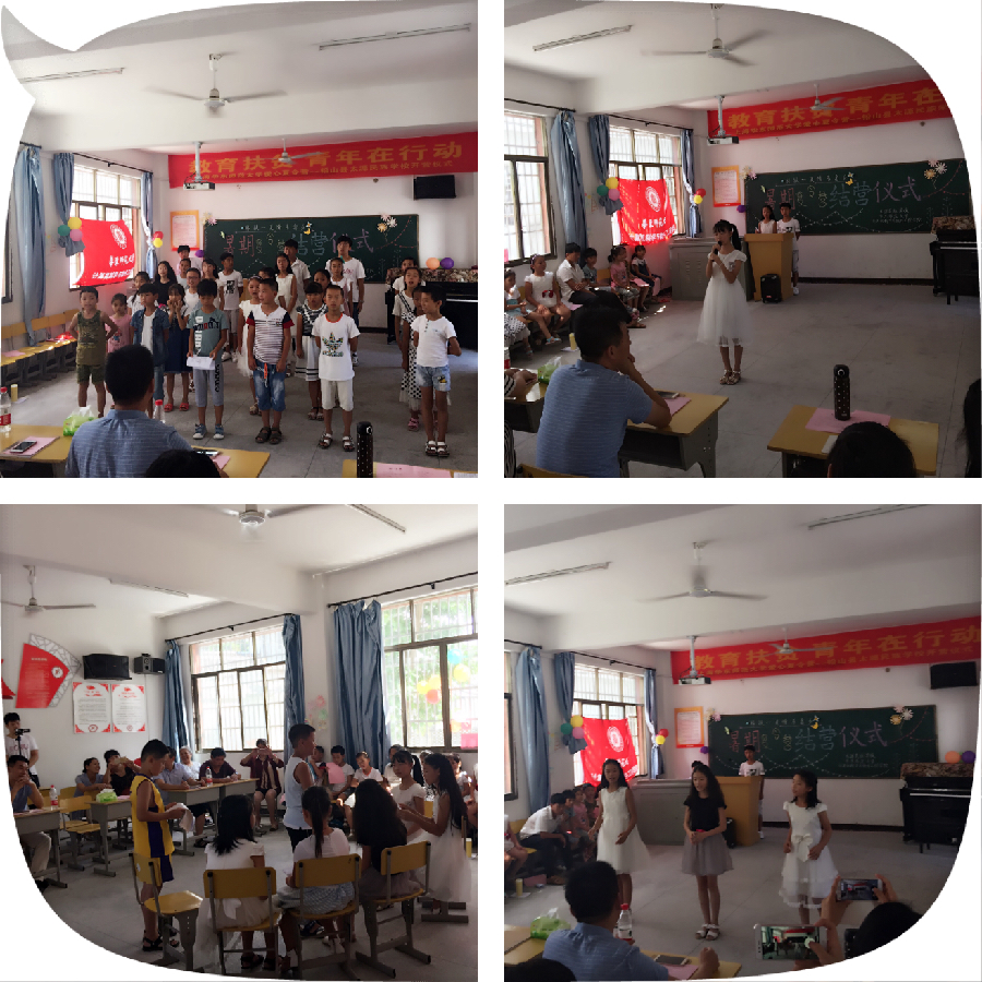 结营仪式翻至尾篇:祝福——志愿者们通过诗朗诵《为了明天》和歌曲《明天会更好》,祝福孩子们拥有一个光辉灿烂的明天,并祝福他们前程无界,阔路无边。随后,师生们一并上台,为孩子们寄语:周文涛说来之前他总想着能给大家带来些什么,在最后又想着能给大家留些什么,但是孩子们能收获到什么是最重要的。林晓倩告诉大家山里的一切都很好,但是山外还有一个更加美丽的世界,她鼓励孩子们走出大山,看看世界。方堃希望希望孩子们记住只要保持着学习的热情,就能拥有更广阔的天地。侯峂欣觉得自己很喜欢畲族的天空,因为这片天就像单纯的孩子们,成为她生命中不可或缺的一部分。毕冉告诉大家老师严格是希望他们拥有一身正气,并祝福孩子们前程似锦。刘馨雨表示看到孩子们这一段时间的成长他心里由衷的幸福,他希望孩子们保持这份纯真,追求自己想要的生活。李明松说在老师们的眼中,自己的员工永远是最可爱的。李凯旋谈到了这十天的感受,祝福孩子们终能实现各自的凌云壮志。吴文翰说他很珍惜与大家相处的时间。志愿者们在寄语时真情流露,几度哽咽,孩子们也哭成了泪人,在对孩子们衷心的祝福和对这段时光无限的回忆里,结营仪式走向了尾声,暑期支教生活也走向了尾声。