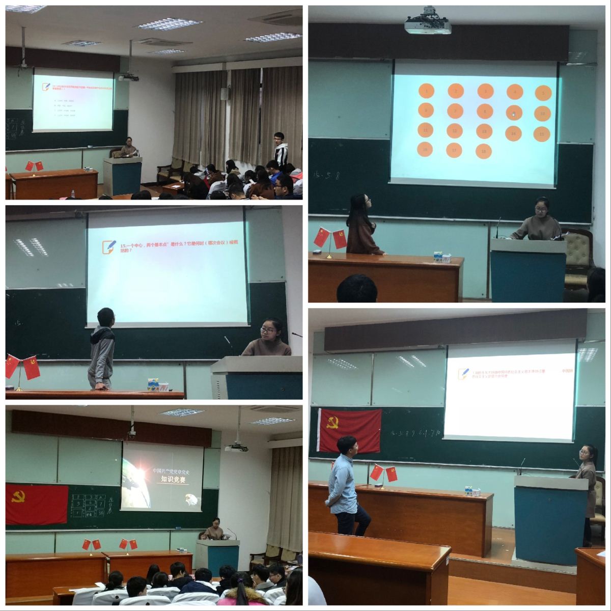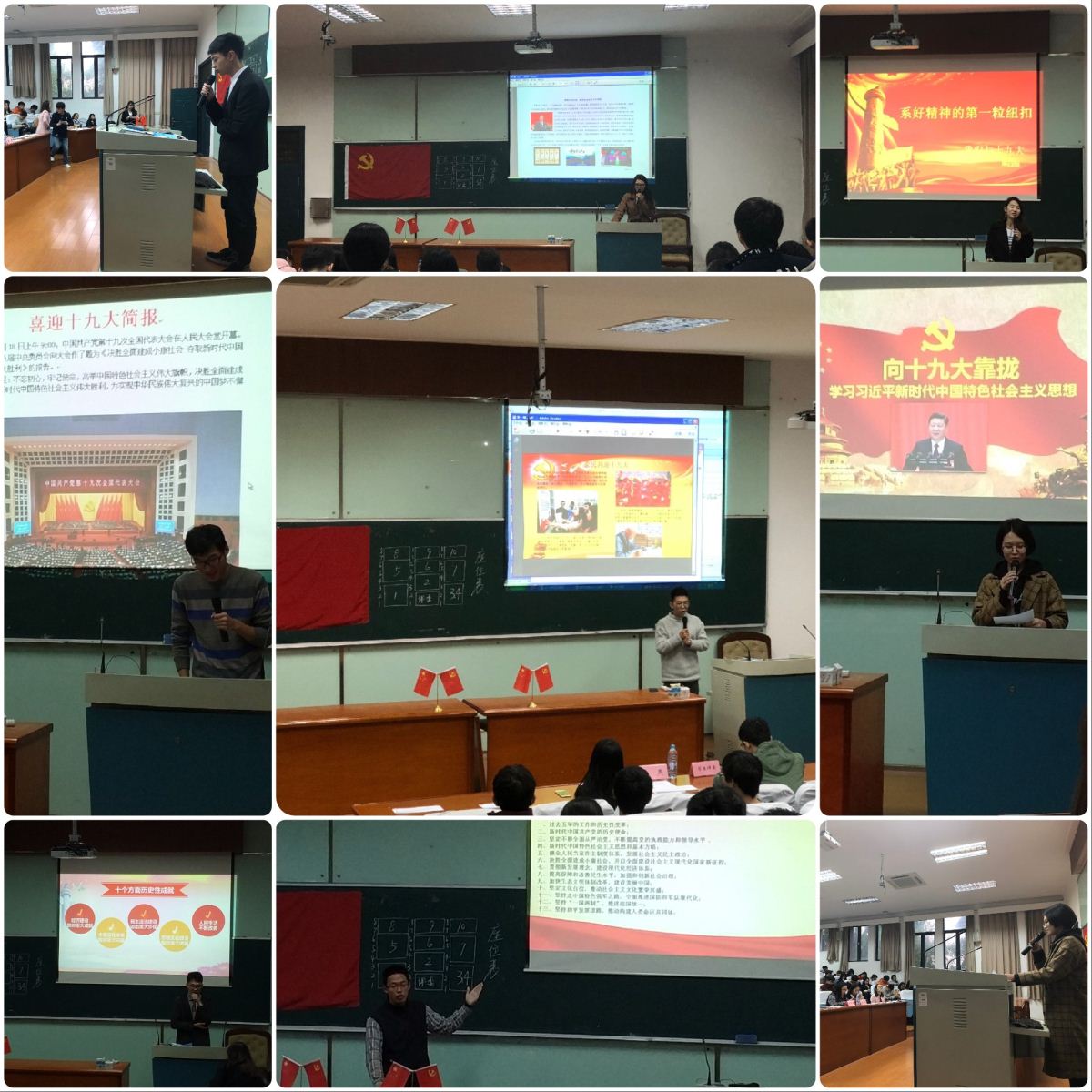 首先进行的是简报展示活动。九个小组代表分别展示了各自小组关于学习十九大的感想和心得。第一小组代表用幽默风趣的语言,回顾党的历史和功绩,表达了共青团员对党的向往与崇敬。第二小组代表盛装出席,沉着冷静地向学员们展示国家的发展历程和未来发展方向并且强调了中国共产党的伟大力量。第三组与第四组代表将简报展示分为四个部分,强调十九大主题,即“不忘初心牢记使命”,呼吁学员们以实际行动,努力成为中国共产党的一员。第五组代表以活泼而不失严肃的风格向学员们展示了历年党的方针,回顾了十八大以来的历史性成就,并且发出倡议“立足当下,着眼未来”。第六组代表首先介绍了简报的主题“回顾十九大,砥砺前行”,着眼十个方面展示历史成就,分享了对十九大的心得与体会。第七组同学的简报坚持庄重朴素,提出了中国共产党不仅注重历史,同时也要规划未来。第八组代表立足于文化建设,以“我们与十九大”为主题,强调文化自信。第九组代表强调要走中国特色社会主义道路。第十组简报提出要深刻学习习近平新时代中国特色社会主义思想,积极贯彻落实十九大精神。