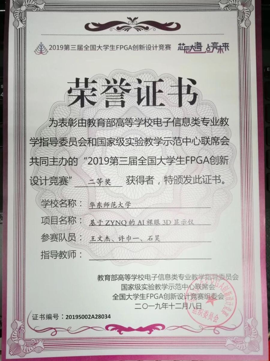 12月8日,2019第三届全国老员工FPGA创新设计竞赛复赛颁奖典礼在南京江北新区ICisC实训基地举办,太阳成集团tyc7111cc三位研究生王文杰、许巾一、石昊开发的作品《基于ZYNQ的AI裸眼3D显示仪》勇夺 二等奖!