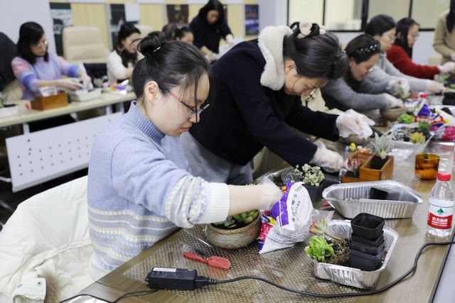 活动现场,园艺辅导师为女教师们详细讲解了多肉植物的基本知识、栽培技巧、日常养护以及病虫害防治等常见问题,并现场指导老师们如何正确种植多肉植物。老师们按照修根、入盆、铺土的步骤进行栽种,在欢声笑语中发挥创意,将一颗颗多肉植物移栽到精美的花盆中。经过一番装点,一盆盆美轮美奂的微景观逐渐展现在眼前,令人赏心悦目。