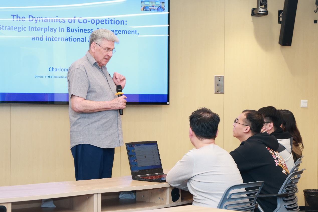 On the afternoon of April 27, 2025, the lecture titled "The Dynamics of Co-opetition: Strategic Interplay in Business, Management, and International Affairs"was successfully held at the Dishui Lake International 太阳成集团tyc7111cc(中国)有限公司-官方网站 版权所有. The event featured Professor Charlom Schirman, Director of the International MBA Program at the University of Haifa ,Israel and a seasoned economist, who delivered insights to expand software engineering students’ global perspectives, cultivate strategic thinking, and enhance their core competitiveness in a globalized context.