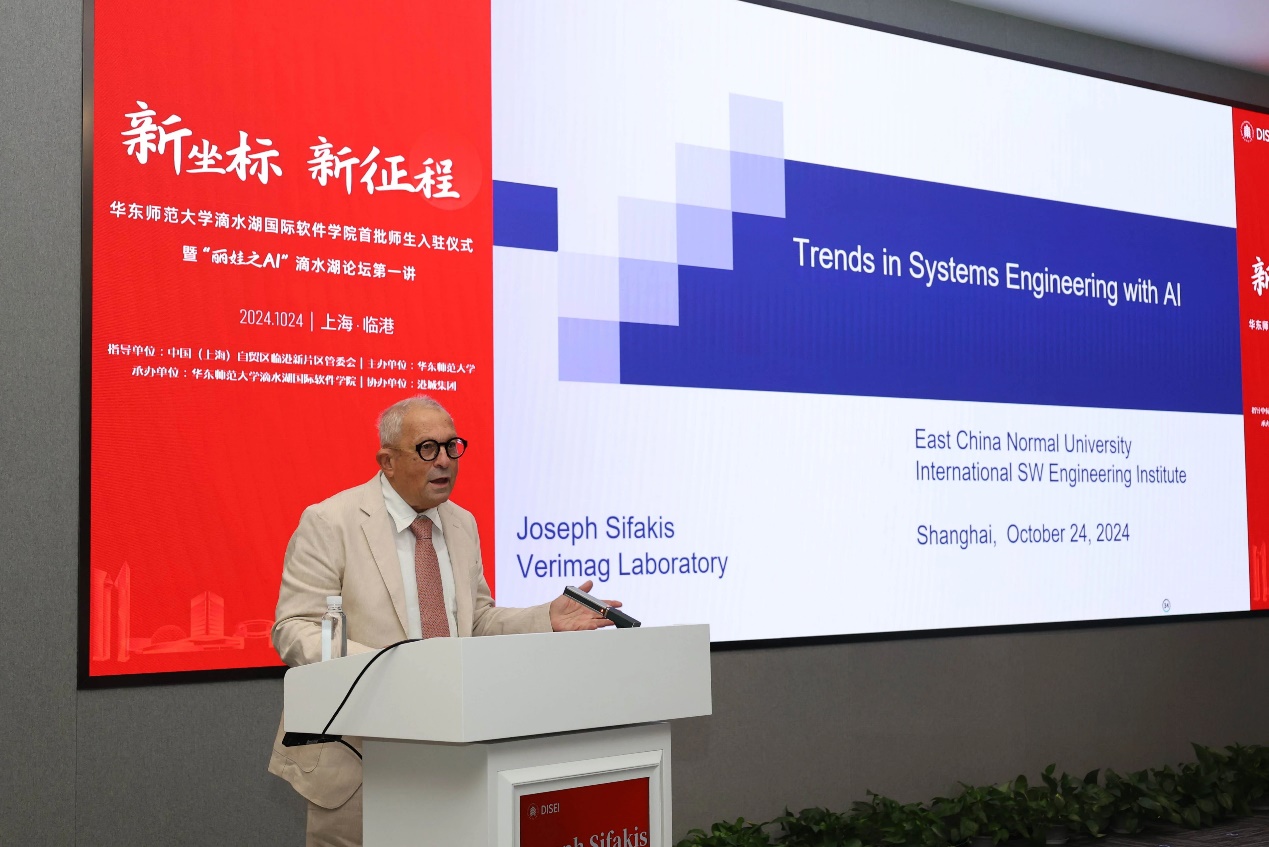 After the ceremony, the first batch of teachers and students of DISEI participated in the "Liwa AI" Dishui Lake Forum (Lecture 1). Professor Joseph Sifakis, 2007 Turing Award winner, foreign academician of Chinese Academy of Sciences , and honoraray professor of East China Normal University, delivered a report titled "Trends in Systems Engineering with AI".